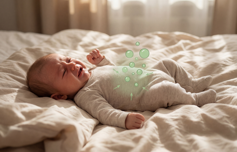 A baby’s digestive system is still developing. When gas gets trapped, lying completely flat can make that pressure harder to move, which can lead to discomfort and sudden crying. Many parents notice their baby seems more settled when held upright — this is often why.