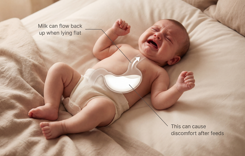 When babies lie completely flat, milk can move back toward the throat instead of staying in the stomach. This can feel uncomfortable and unfamiliar, especially after feeds, and many babies respond by waking, fussing, or arching their back. Some babies don’t spit up, which is why this often goes unnoticed — but they still feel the discomfort.