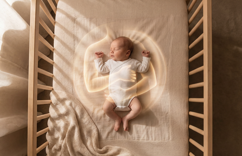 For nine months, your baby was held in a warm, snug environment. Lying flat on an open mattress can feel unfamiliar, which can trigger the startle reflex and wake them up. That’s why many babies sleep better when held against your chest — they feel secure, contained, and calm.